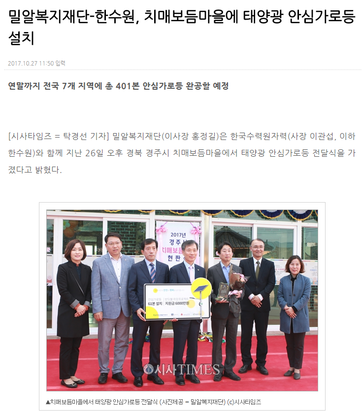 [시사타임즈] 밀알복지재단-한수원, 치매보듬마을에 태양광 안심가로등 설치