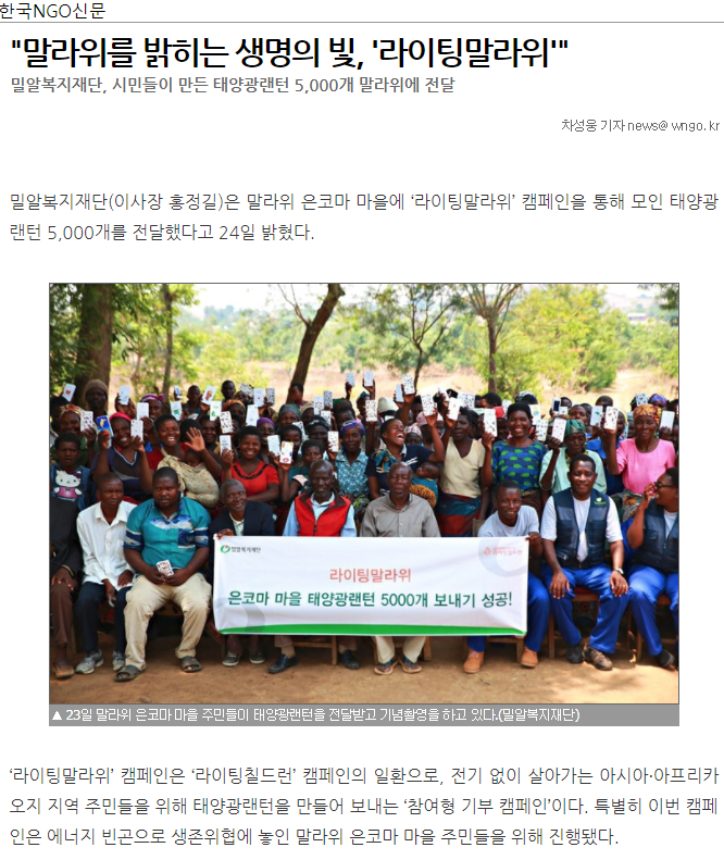 [한국NGO신문] "말라위를 밝히는 생명의 빛, '라이팅말라위'"
