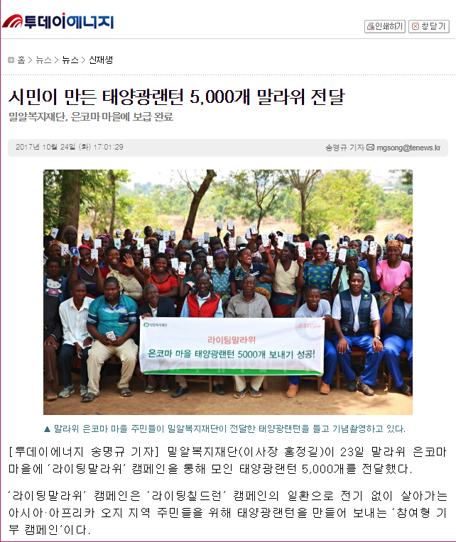 [에너지데일리] 밀알복지재단, 말라위에 태양광 빛을 보냈다