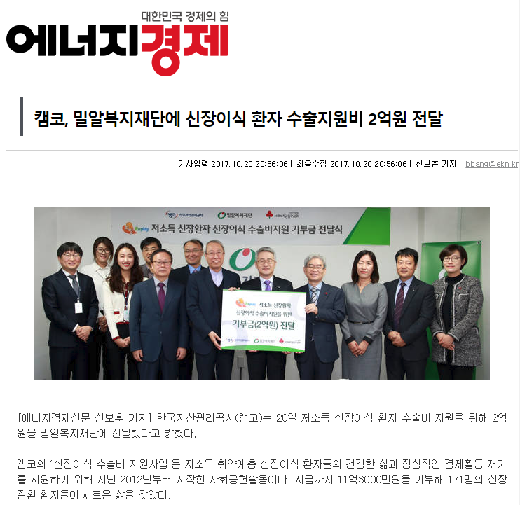 [에너지경제] 캠코, 밀알복지재단에 신장이식 환자 수술지원비 2억원 전달