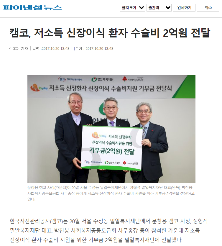 이전 [국제뉴스] 캠코, 저소득 신장이식 환자 돕기 기부금 2억원 전달 다음 [매일일보] 캠코, 저소득 신장이식 환자 위한 기부금 2억원 전달