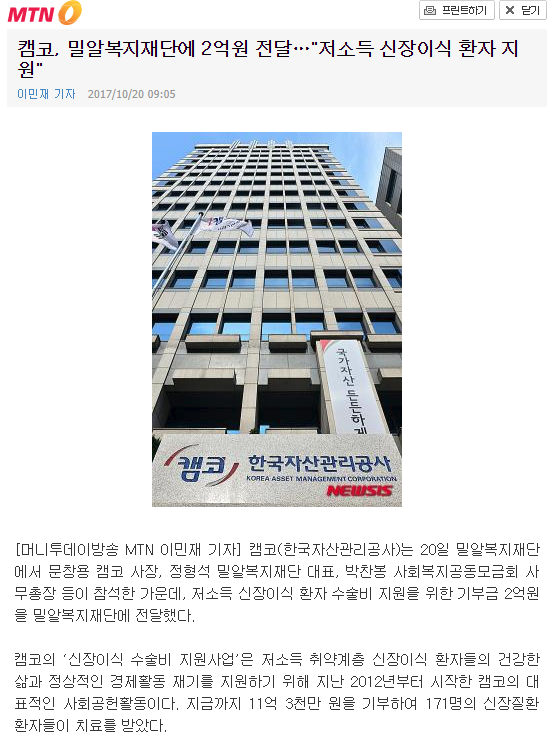 [머니투데이] 캠코, 밀알복지재단에 2억원 전달…"저소득 신장이식 환자 지원"