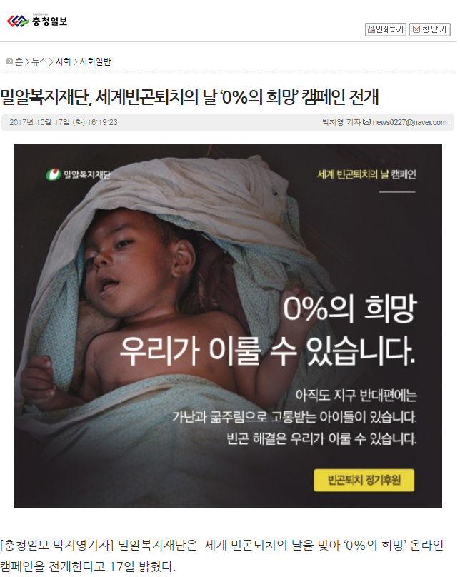[충청일보] 밀알복지재단, 세계빈곤퇴치의 날 ‘0%의 희망’ 캠페인 전개