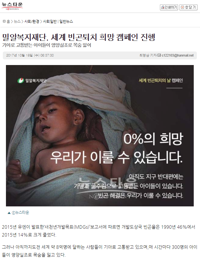 [뉴스타운] 밀알복지재단, 세계 빈곤퇴치 희망 캠페인 진행