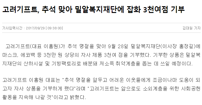 [월드스타] 고려기프트, 추석 맞아 밀알복지재단에 잡화 3천여점 기부