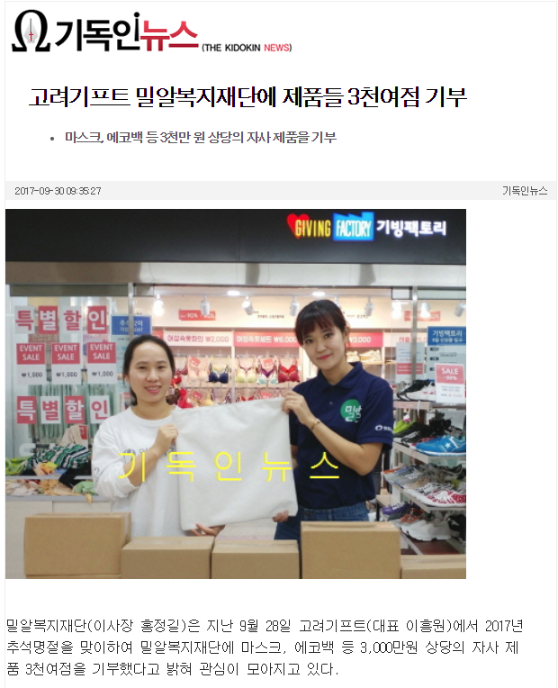 [기독인뉴스] 고려기프트 밀알복지재단에 제품들 3천여점 기부