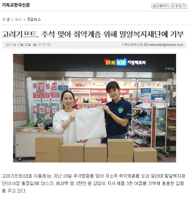 [기독교한국신문] 고려기프트, 추석 맞아 취약계층 위해 밀알복지재단에 기부