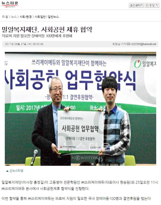 [기독인뉴스] 쓰리제이에듀와 밀알복지재단 사회공헌 협약식 체결