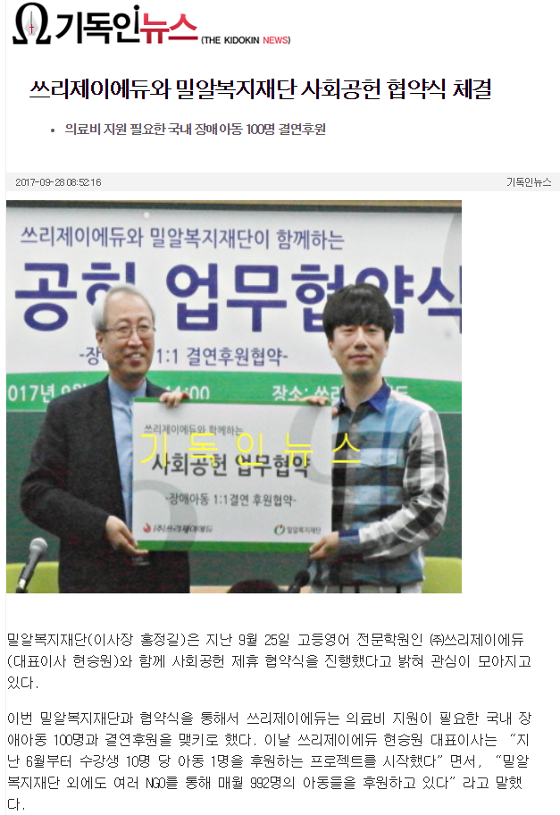 [기독인뉴스] 쓰리제이에듀와 밀알복지재단 사회공헌 협약식 체결