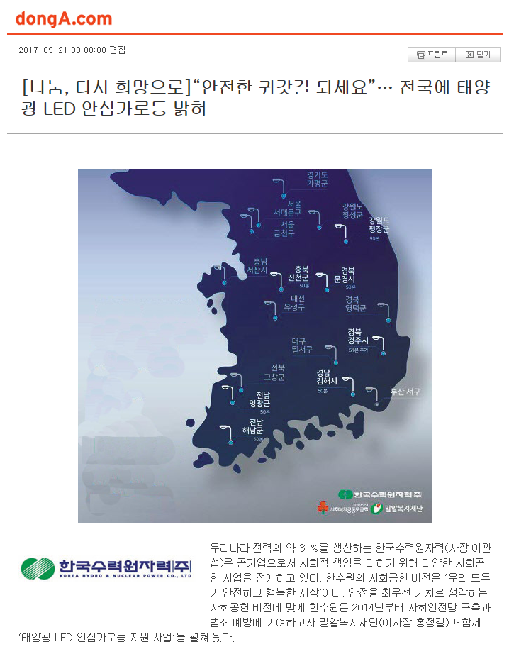 [동아일보] [나눔, 다시 희망으로]“안전한 귀갓길 되세요”… 전국에 태양광 LED 안심가로등 밝혀