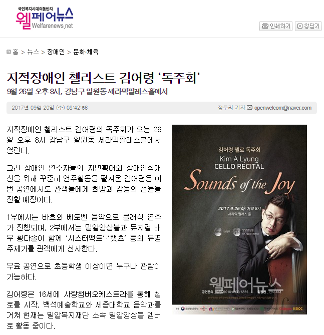 [웰페어뉴스] 지적장애인 첼리스트 김어령 ‘독주회’