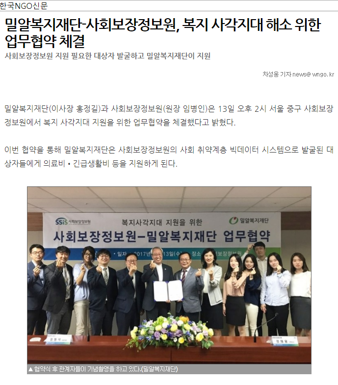 [한국NGO신문] 밀알복지재단-사회보장정보원, 복지 사각지대 해소 위한 업무협약 체결