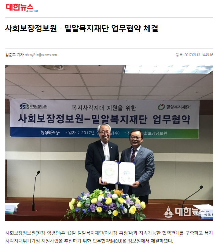 [뉴스타운] 밀알복지재단, 복지 사각지대 해소 업무협약