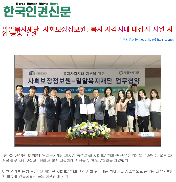 [한국인권신문] 밀알복지재단-사회보장정보원, 복지 사각지대 대상자 지원 사업 공동 추진