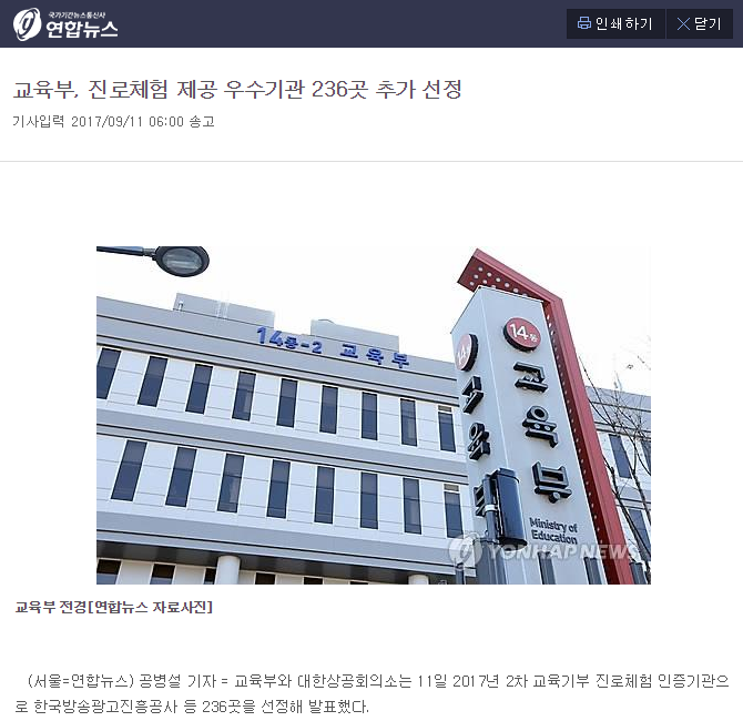 [연합뉴스] 교육부, 진로체험 제공 우수기관 236곳 추가 선정