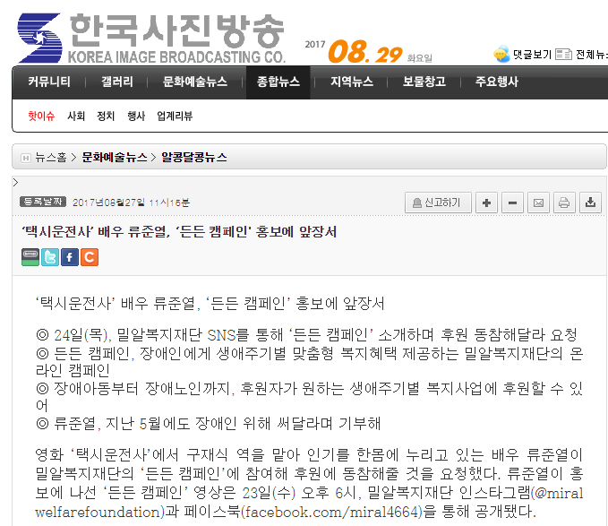 [금강일보] '택시운전사’ 배우 류준열, ‘든든 캠페인’ 홍보에 앞장서