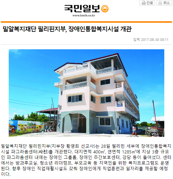 [국민일보] 밀알복지재단 필리핀지부, 장애인통합복지시설 개관