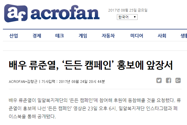 [아크로팬] 배우 류준열, ‘든든 캠페인’ 홍보에 앞장서