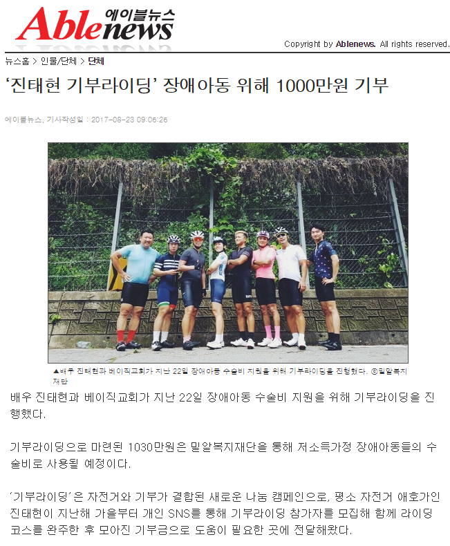 [에이블뉴스] ‘진태현 기부라이딩’ 장애아동 위해 1000만원 기부