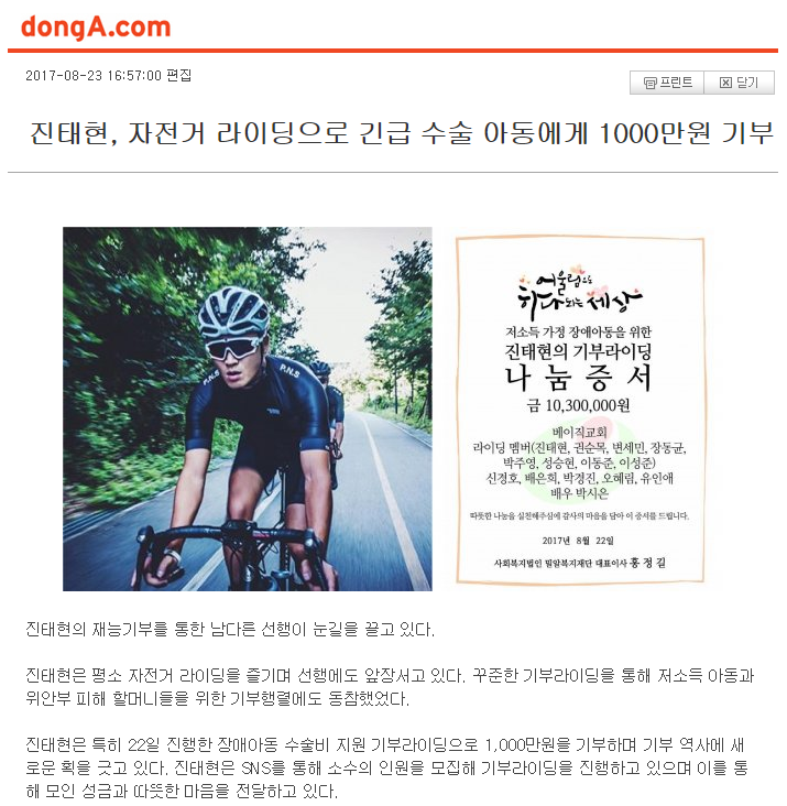 [스포츠동아] 진태현, 자전거 라이딩으로 긴급 수술 아동에게 1000만원 기부