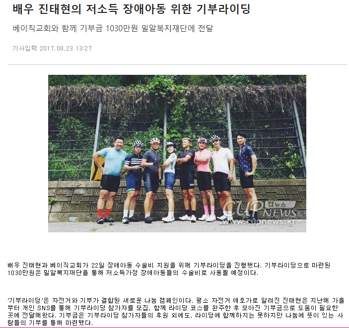 [베이비뉴스] 배우 진태현, 기부라이딩으로 장애아동 의료비 1천만 원 기부
