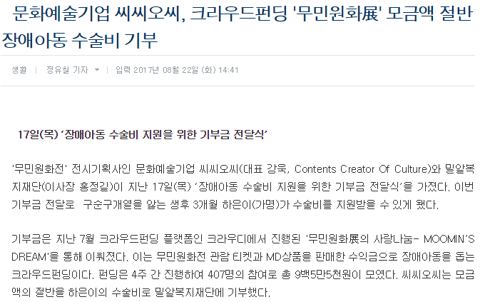 [브레인미디어] 문화예술기업 씨씨오씨, 크라우드펀딩 '무민원화展' 모금액 절반 장애아동 수술비 기부
