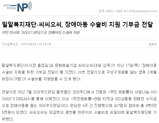 [복지연합신문] 밀알복지재단-씨씨오씨, 장애아동 수술비 지원 기부금 전달식