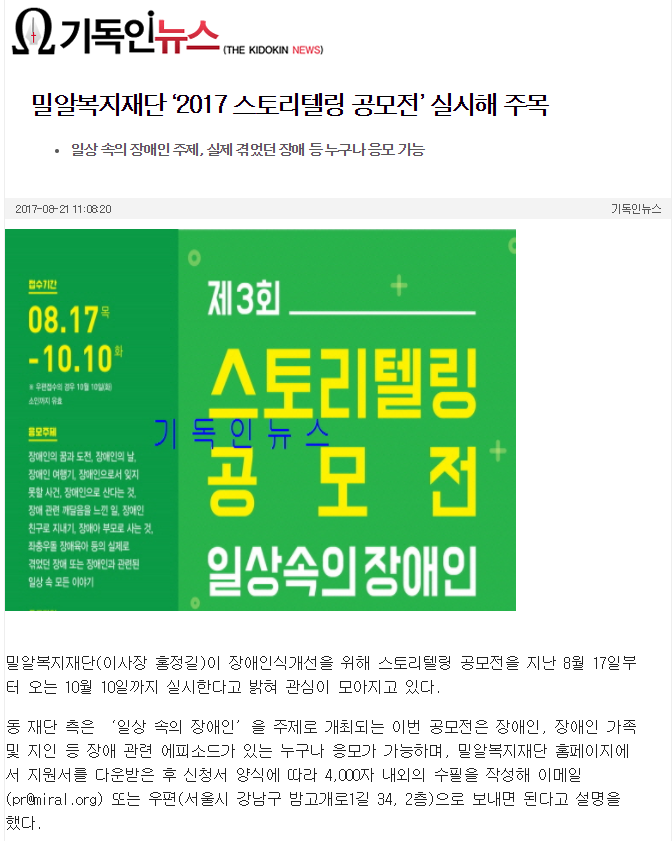 [기독인뉴스] 밀알복지재단 '2017 스토리텔링 공모전' 실시해 주목
