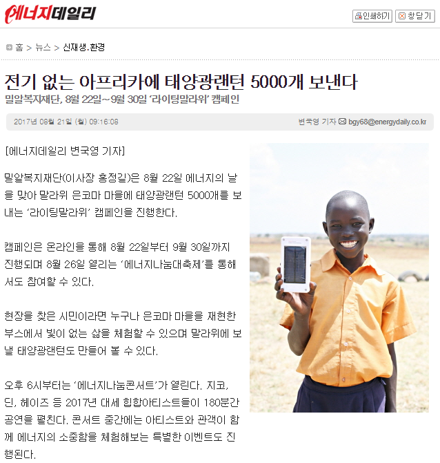 [에너지데일리] 전기 없는 아프리카에 태양광랜턴 5000개 보낸다