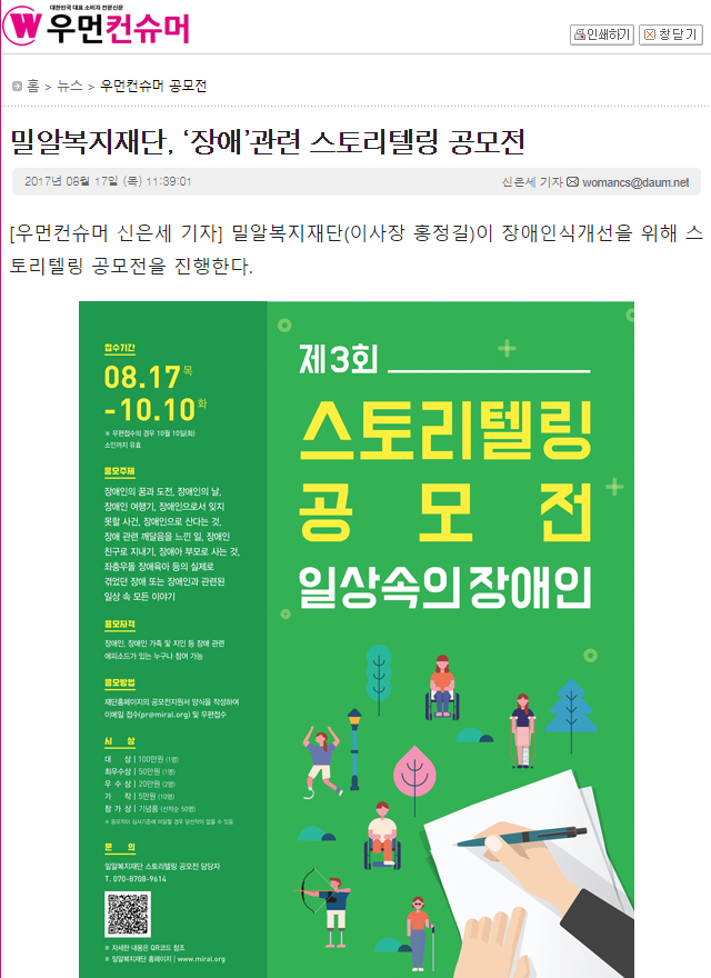 [우먼컨슈머] 밀알복지재단, ‘장애’관련 스토리텔링 공모전