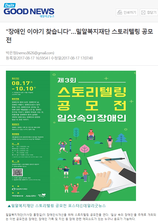 [데일리굿뉴스] "장애인 이야기 찾습니다"…밀알복지재단 스토리텔링 공모전
