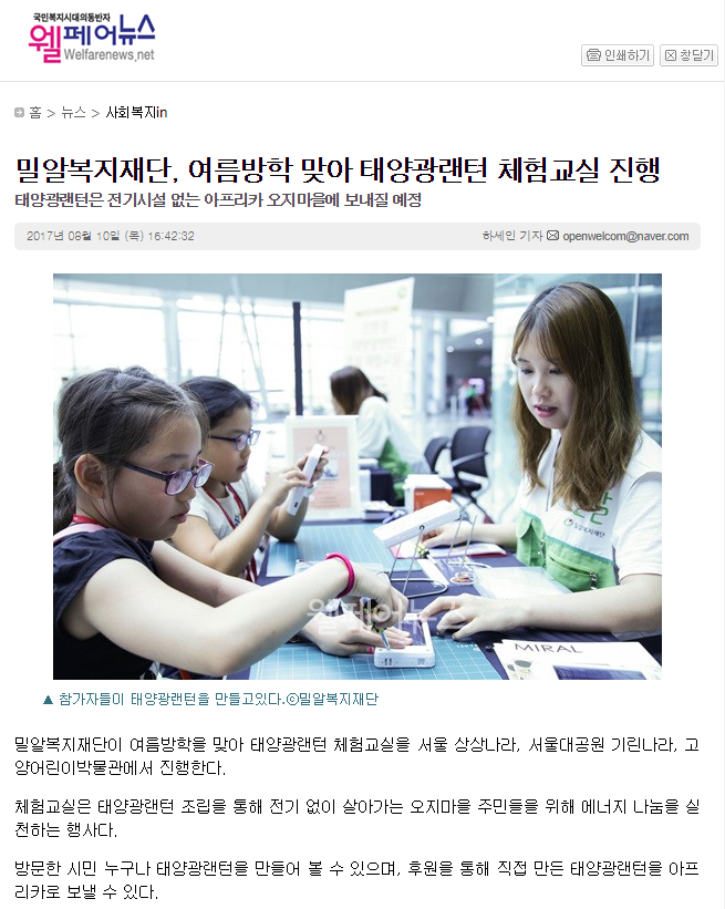 [웰페어뉴스] 밀알복지재단, 여름방학 맞아 태양광랜턴 체험교실 진행