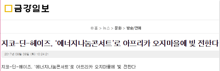 [금강일보] 지코-딘-헤이즈, ‘에너지나눔콘서트’로 아프리카 오지마을에 빛 전한다