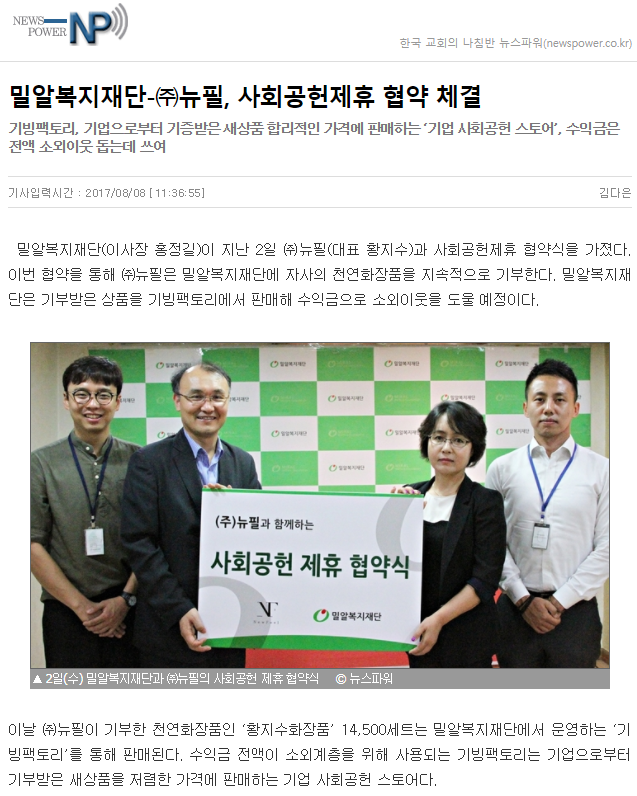 [뉴스파워] 밀알복지재단-㈜뉴필, 사회공헌제휴 협약 체결
