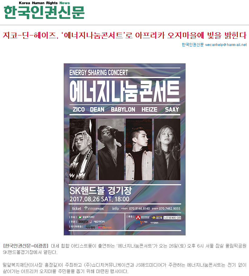 [한국인권신문] 지코-딘-헤이즈, ‘에너지나눔콘서트’로 아프리카 오지마을에 빛을 밝힌다