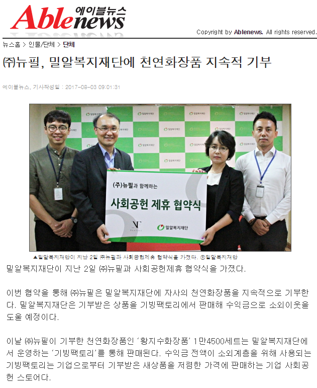 [에이블뉴스] ㈜뉴필, 밀알복지재단에 천연화장품 지속적 기부