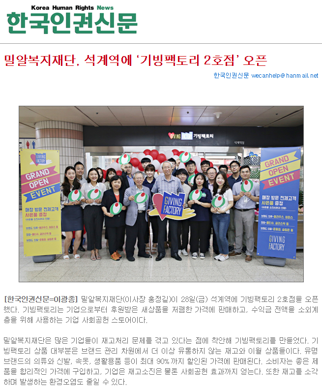 [한국인권신문] 밀알복지재단, 석계역에 ‘기빙팩토리 2호점’ 오픈
