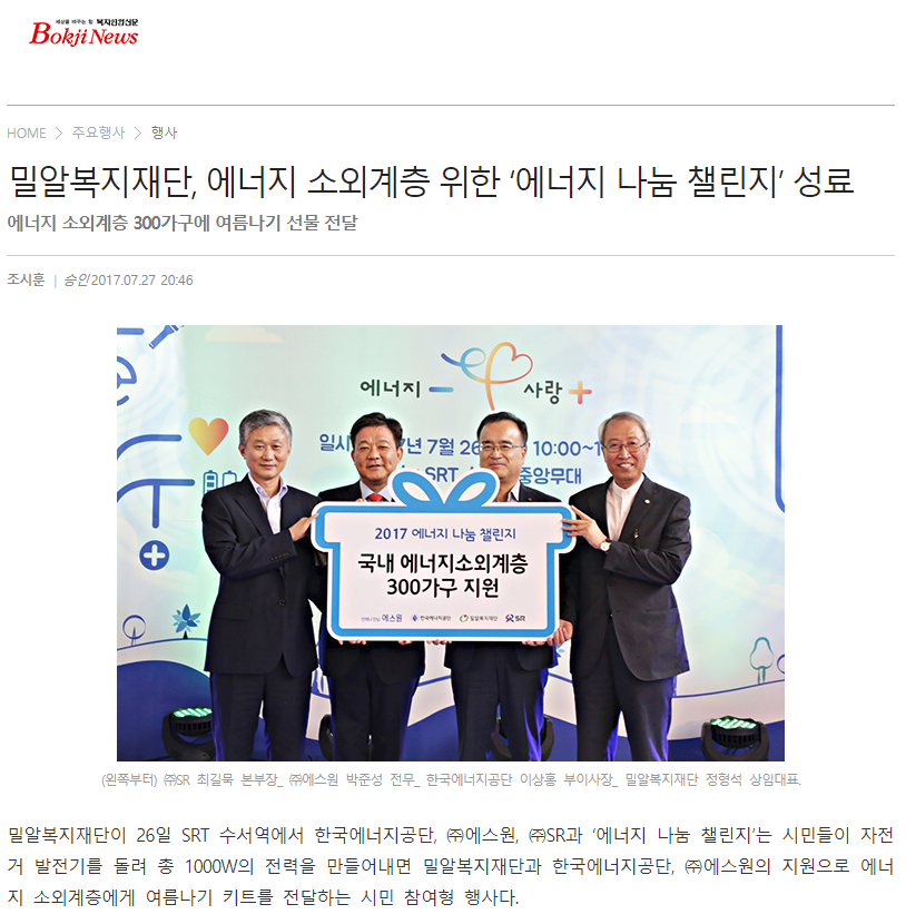 [웰페어뉴스] 밀알복지재단, 에너지 소외계층 위한 ‘에너지 나눔 챌린지’