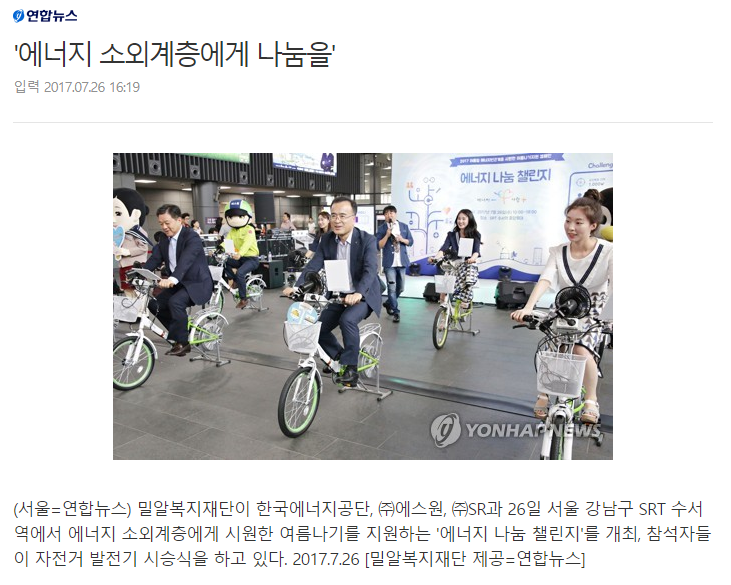 [에너지데일리] 자전거 발전으로 모은 에너지로 소외계층 냉방 지원