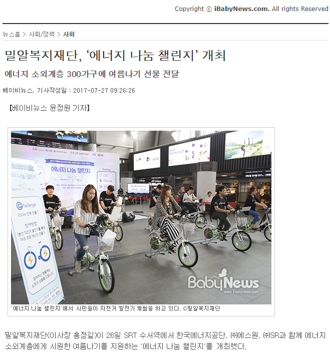 [베이비뉴스] 밀알복지재단, ‘에너지 나눔 챌린지’ 개최