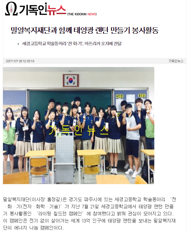 [기독인뉴스] 밀알복지재단과 함께 태양광 랜턴 만들기 봉사활동