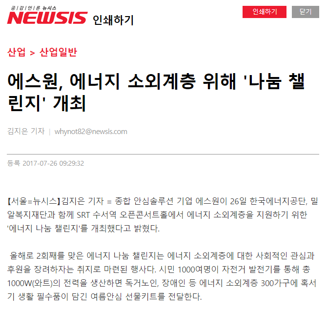 [뉴시스] 에스원, 에너지 소외계층 위해 '나눔 챌린지' 개최