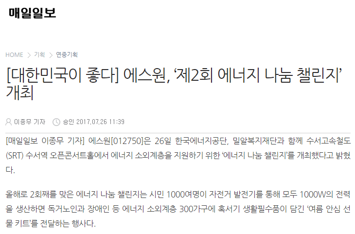 [미디어펜] 에스원, 에너지 소외계층을 위한 '에너지 나눔 챌린지' 개최