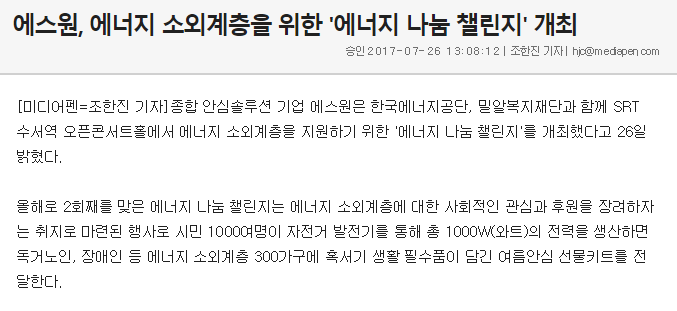 [미디어펜] 에스원, 에너지 소외계층을 위한 '에너지 나눔 챌린지' 개최