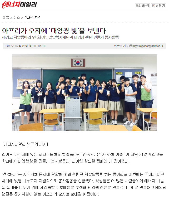 이전 [투데이에너지] 세경고 학술동아리, 태양광랜턴 만들기 봉사 다음 [아크로팬] 세경고등학교 학술동아리, 태양광 랜턴 만들기 봉사활동 실시