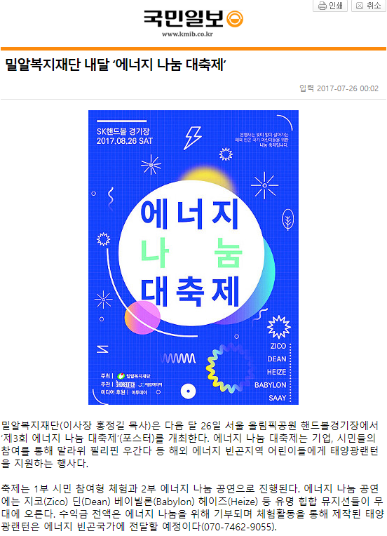 [국민일보] 밀알복지재단 내달 ‘에너지 나눔 대축제’
