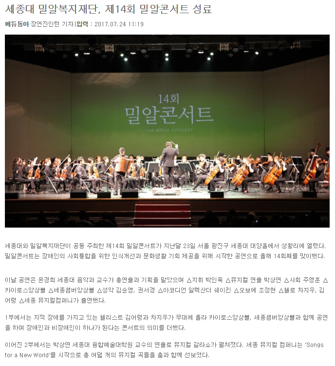 [에듀동아] 세종대 밀알복지재단, 제14회 밀알콘서트 성료