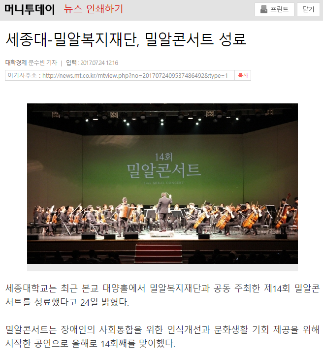 [머니투데이] 세종대-밀알복지재단, 밀알콘서트 성료