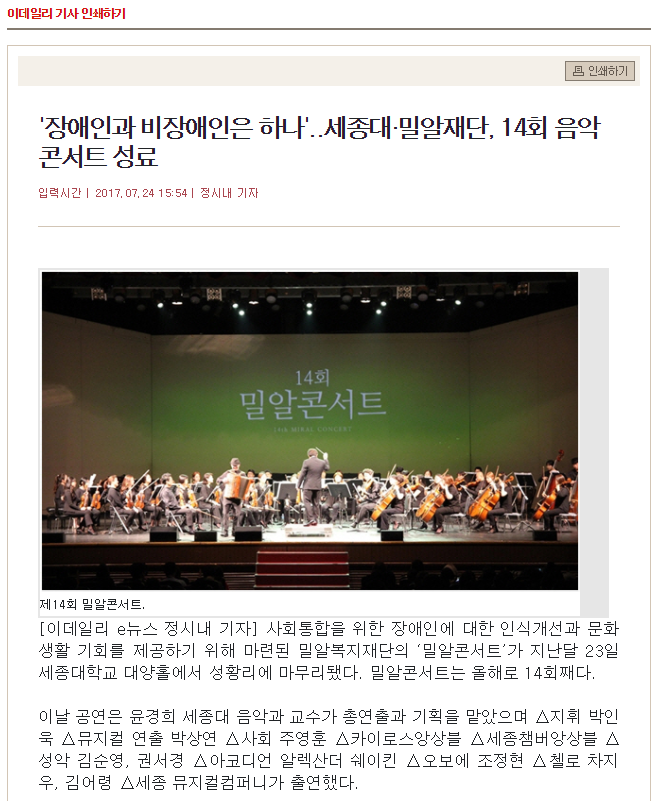 [이데일리] '장애인과 비장애인은 하나'..세종대·밀알재단, 14회 음악콘서트 성료