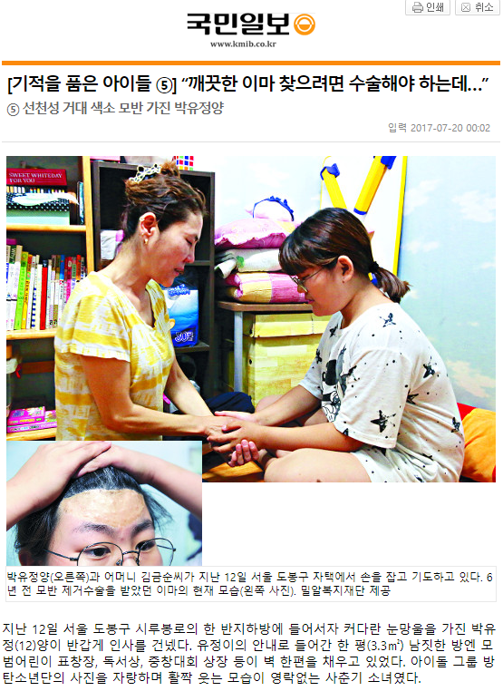 [국민일보] [기적을 품은 아이들 ⑤] “깨끗한 이마 찾으려면 수술해야 하는데…”